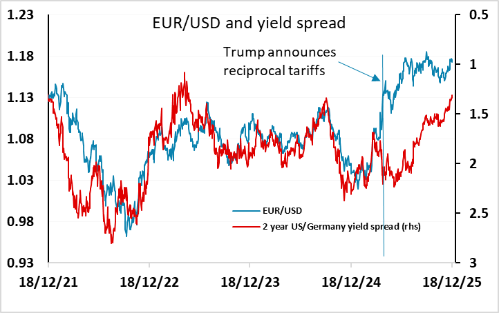 The USD has been strong against the JPY in recent weeks, but broadly rangebound against most other currencies, and closer to the bottom of its range against most of the riskier currencies. However, we see some risk of a turn lower in EUR/USD having failed the test of 1.18 if we see evidence of a continued strong US growth picture. While the softer US CPI data in October/November might be seen as a reason to see more scope for Fed easing, some see the data as potentially distorted by Black Friday and there has been little change in market expectations of the Fed. Coming into the New Year there is little expectation of any significant changes in monetary policy in the majors in Q1, which suggests the market will be looking for different drivers.
