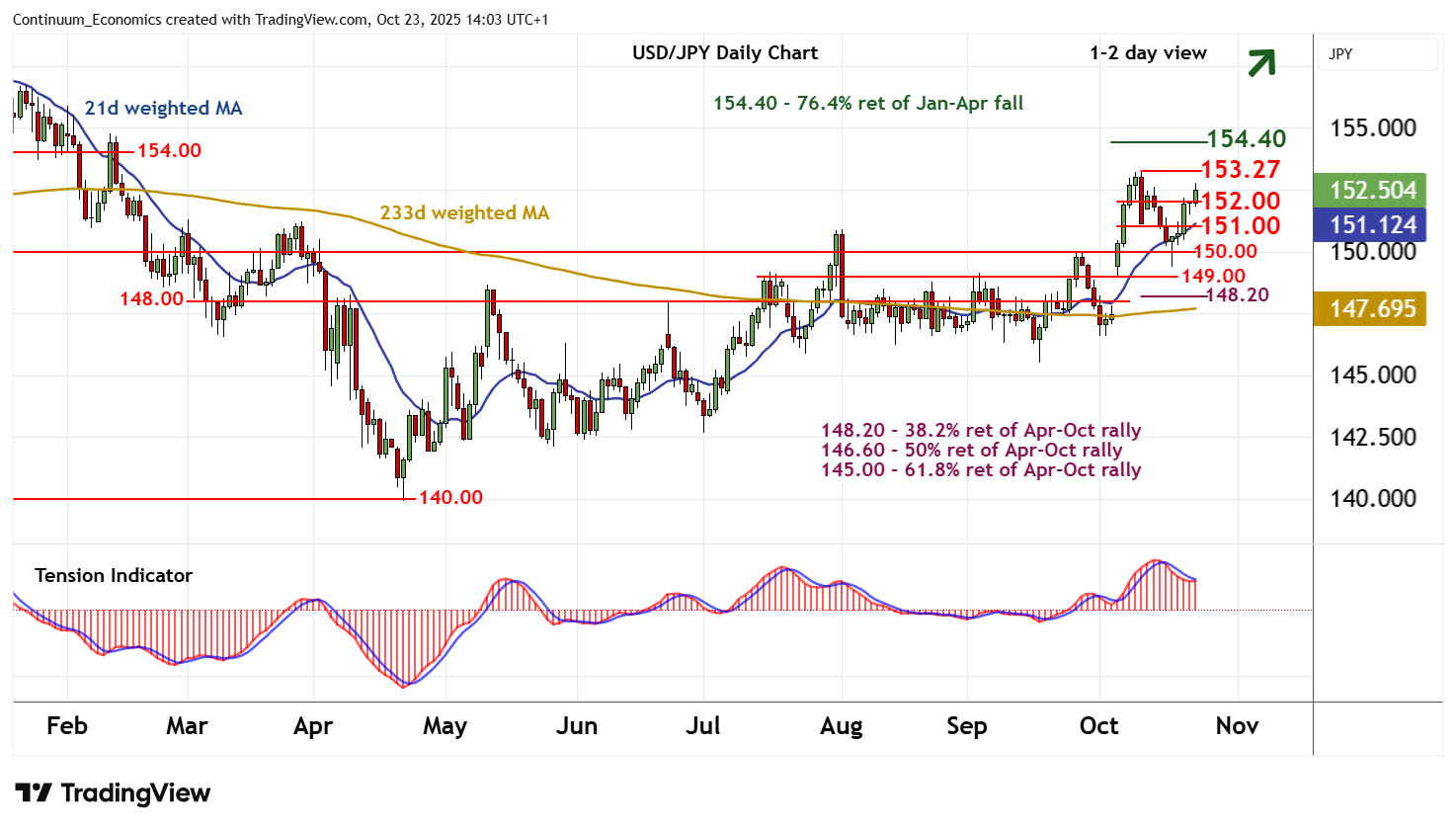 13:45 BST - Consolidation has given way to a break above 152.00 in JPY-driven trade, with prices reaching 152.80~ before settling back. Daily readings are improving and broader weekly charts are positive, highlighting room for a test of strong resistance at the 153.27 current year high of 10 October. But a further close above here is needed to turn sentiment positive and confirm continuation of April gains towards the 154.40 Fibonacci retracement. Meanwhile, support is raised to congestion around 152.00. A close beneath here would turn sentiment neutral and give way to consolidation above 151.00.