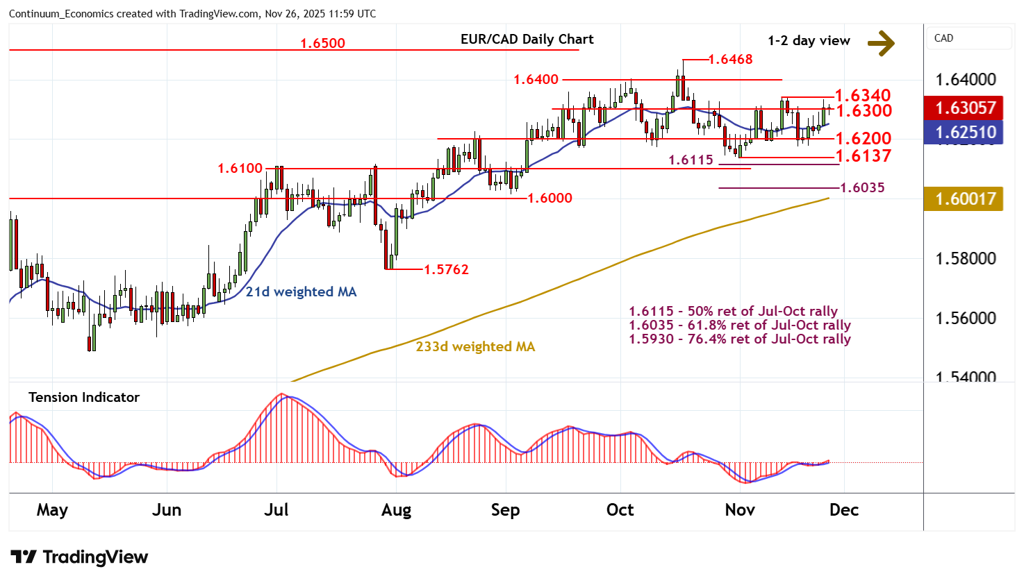 11:50 GMT - Little change, as prices extend cautious trade around congestion resistance at 1.6300, following the anticipated test of resistance at the 1.6340 weekly high of 13 November. Intraday studies are under pressure, highlighting room for a minor pullback. But rising daily readings should limit scope in renewed buying interest/consolidation above congestion support at 1.6200. Meanwhile, a break above 1.6340 will improve sentiment and extend November gains towards 1.6400, where mixed/negative weekly charts are expected to prompt fresh selling interest.