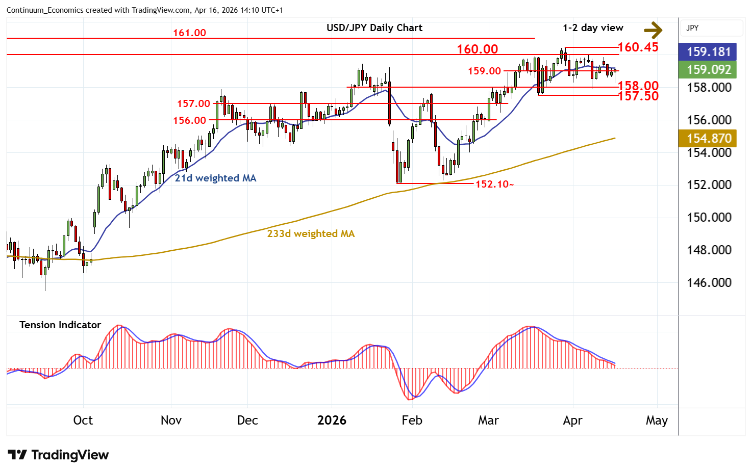 | R1 | 159.00 | * | congestion | S4 | 156.35 | ** | 50% ret of Feb-Mar rally |
