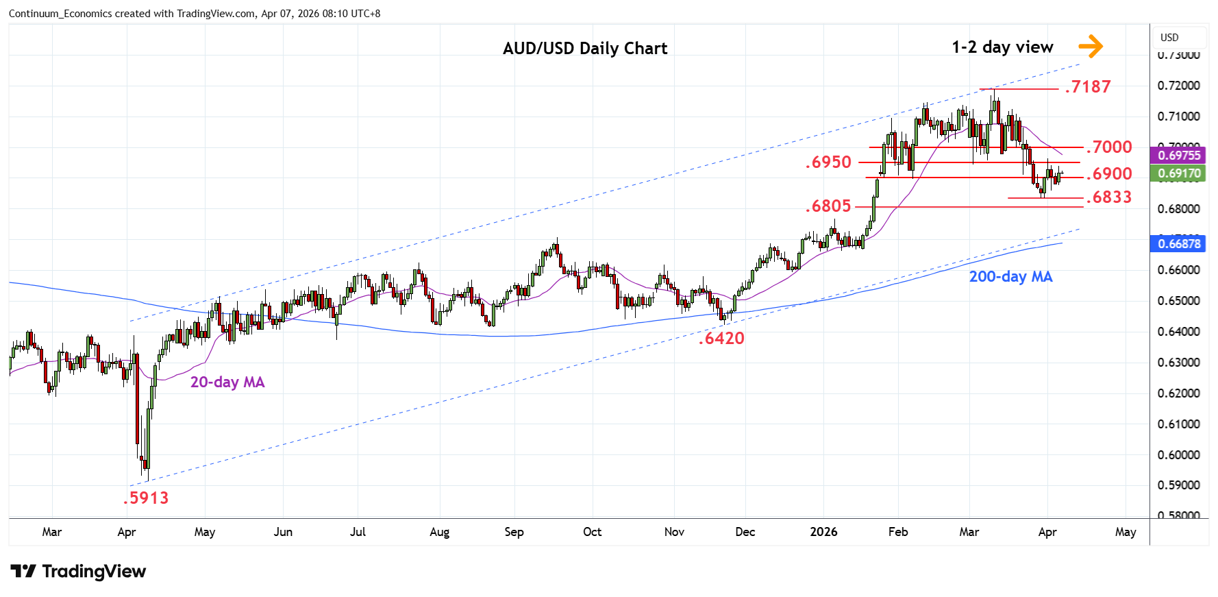 00:20 GMT - Edged higher in consolidation to extend bounce from the .6860/33 lows of last week and regaining the .6900 level sets up scope for retest of .6950/62 congestion and 1 April high. Break here and the .7000 figure will fade the downside pressure and open up room for stronger gains to the .7050/.7100 area. Meanwhile, support at the .6860/33 lows underpin. Would take break here to extend losses from the .7187 March current year high and see deeper pullback to retrace gains from the November low to .6805, 50% Fibonacci retracement.