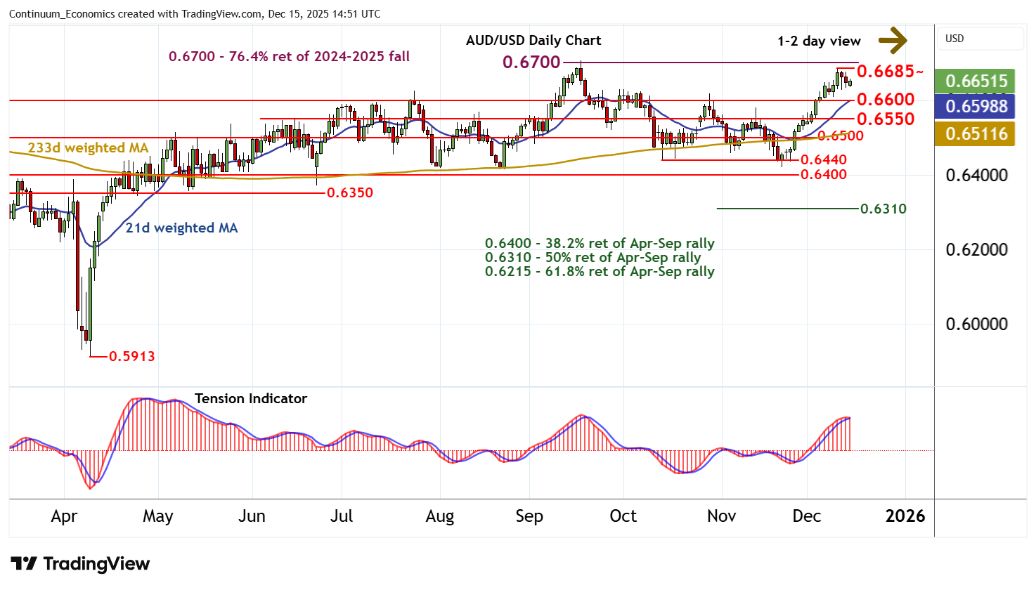 14:35 GMT -Still little change, as mixed intraday studies keep near-term sentiment cautious and extend consolidation beneath the 0.6685 weekly high of 10 December. Overbought daily stochastics are unwinding and the daily Tension Indicator is also turning down, highlighting room for fresh losses in the coming sessions towards congestion support at 0.6600. However, rising weekly charts should limit any initial tests in renewed consolidation. Following cautious/corrective trade, fresh gains are looked for. A break above critical resistance at the 0.6700 Fibonacci retracement and the 0.6705 current year high of 17 September will improve sentiment and open up a test of 0.6800.