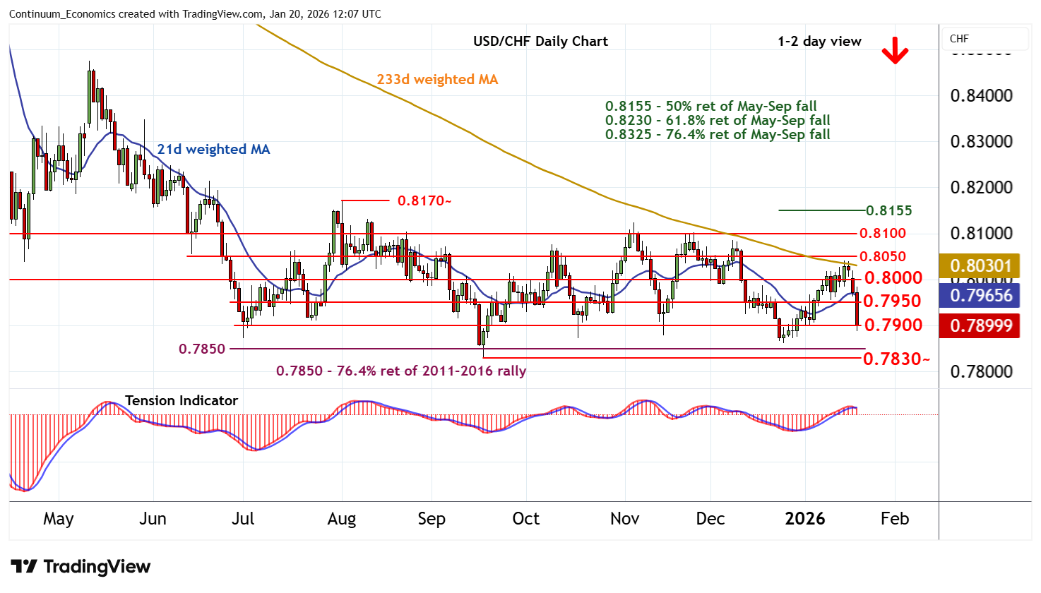 11:50 GMT - Cautious trade has given way to anticipated losses, with sharp selling interest prompting a swift fall to congestion support at 0.7900. Daily studies have turned down and broader weekly charts have turned mixed/negative, highlighting room for still further losses in the coming sessions. A break below 0.7900 will open up critical support at the 0.7850 Fibonacci retracement and the 0.7830~ year low of 17 September 2025. A close beneath here will add weight to sentiment and extend December 2016 losses initially to 0.7800. Meanwhile, resistance is lowered to congestion around 0.7950. A close above here, if seen, will help to stabilise price action and prompt consolidation beneath here congestion around 0.8000.