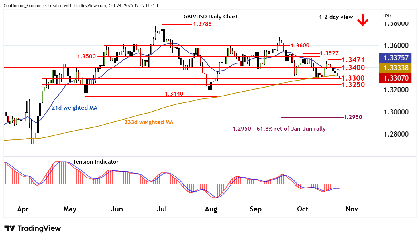 12:15 BST - Anticipated losses have reached congestion support at 1.3300, where fresh consolidation is developing. Daily readings continue to deteriorate and broader weekly charts are negative, highlighting room for fresh losses in the coming sessions. A break below 1.3300 will open up further congestion around 1.3250. Continuation of mid-September losses towards 1.3200 cannot be ruled out. Meanwhile, resistance remains at congestion around 1.3400. A close above here, if seen, would help to stabilise price action and give way to consolidation beneath the 1.3471 weekly high of 17 October.
