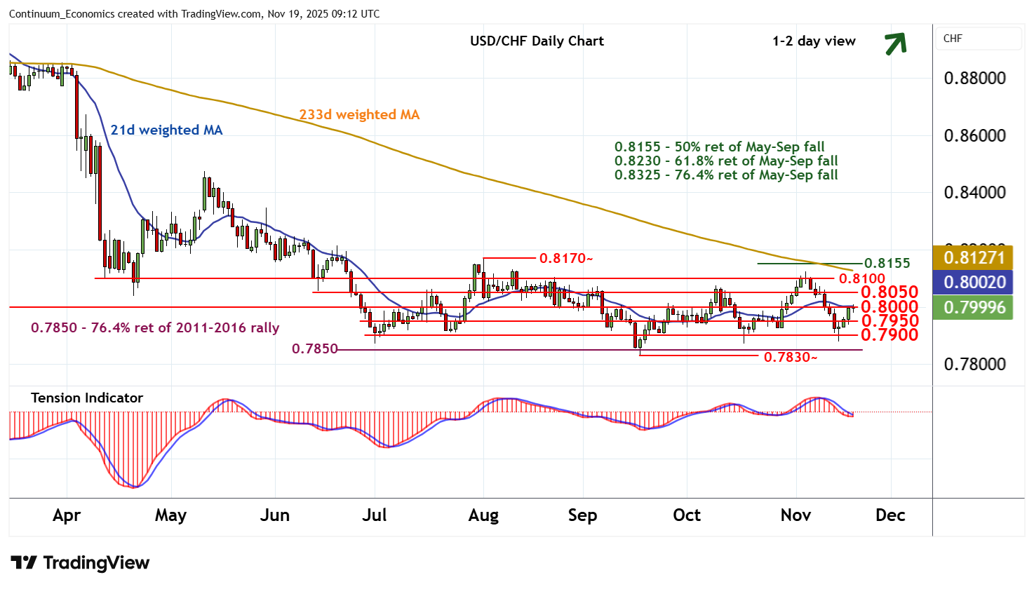 09:05 GMT - Cautious trade has given way to the anticipated test of congestion resistance at 0.8000 in both USD- and CHF-driven trade, where unwinding overbought intraday studies are prompting renewed consolidation. Oversold daily stochastics are unwinding and the bearish daily Tension Indicator is flattening, highlighting room for further strength in the coming sessions. A break above here will open up the 0.8050 break level. But deteriorating weekly charts are expected to limit any initial tests in consolidation. Meanwhile, support remains at congestion around 0.7900. Critical support, however, is at the 0.7830 current year low of 17 September and the 0.7850 Fibonacci retracement. A close beneath here would turn sentiment negative and extend December 2016 losses initially towards 0.7800.