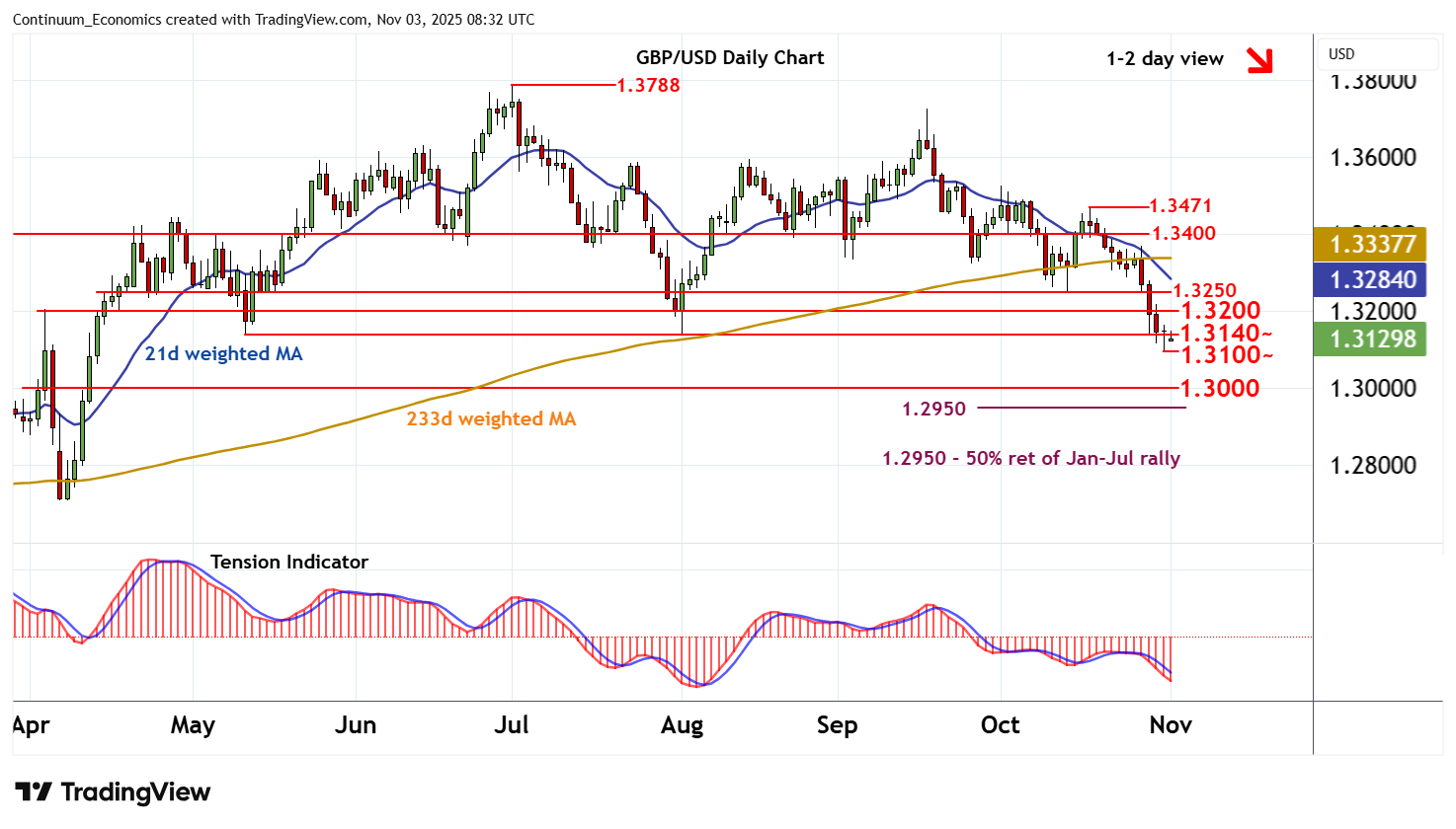 08:10 GMT - The anticipated break below the 1.3140~ May-August range lows has reached 1.3100~, where mixed intraday studies and flat oversold daily stochastics are prompting short-term reactions. However, the daily Tension Indicator continues to track lower and broader weekly charts are also under pressure, highlighting room for further losses in the coming sessions. A later break below the 1.3100~ monthly low of 31 October will add weight to sentiment and extend July losses, initially targeting congestion around 1.3000. Meanwhile, a close back above 1.3140~ would help to stabilise price action and prompt consolidation beneath congestion around 1.3200.