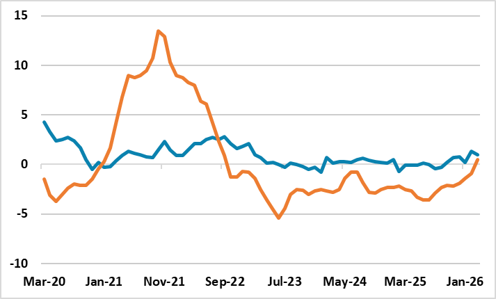 • Higher oil prices starting to feedthrough. PPI swung back into positive territory on a Yr/Yr basis (Figure 1), as higher oil prices from the Iran war feedthrough. Given lags and the still elevated energy prices for Q2/Q3 delivery it is likely that PPI will be further boosted in the coming months. However, the CPI impact has been controlled, which reflects initial restrictions on the feedthrough of global oil prices. It will still likely feedthrough to CPI later in the year, as China appears reluctant to undertake a major release of commercial and strategic oil stockpiles. This could boost 2026 CPI by around 0.3-0.4% and we changed our 2026 forecast to 1.4% in the March Outlook (here) -- the higher price of Fertilizers will also have an impact, which could also boost Food prices later in the year.