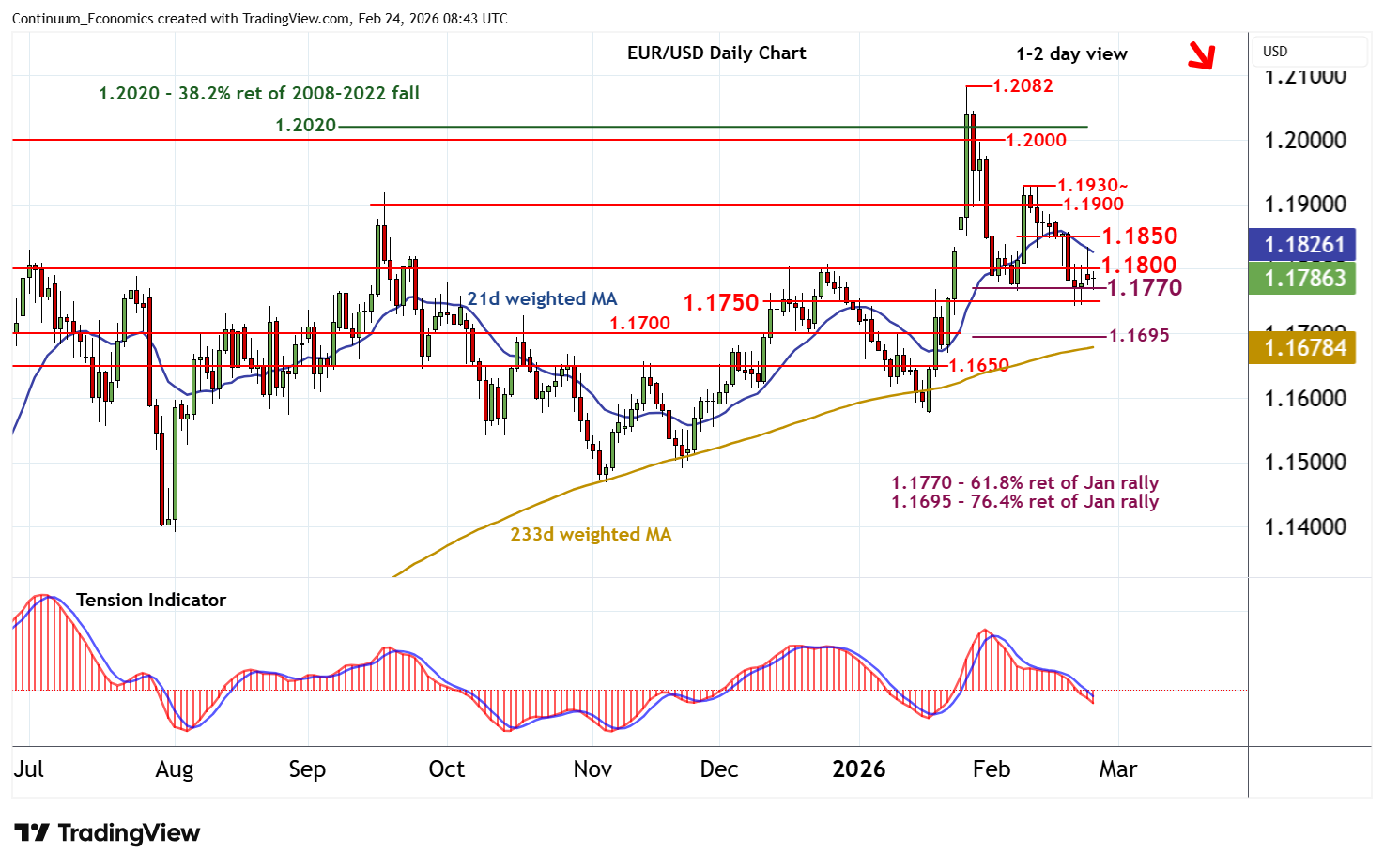 08:35 GMT - Little change, as consolidation above 1.1800 gives way to a drift lower into fresh consolidation above support at the 1.1770 Fibonacci retracement. Oversold daily stochastics are flattening, suggesting potential for further cautious trade above here. But the bearish daily Tension Indicator and negative weekly charts point to a later break towards congestion around 1.1750. A further close beneath here will add weight to sentiment and extend January losses towards strong support at the 1.1695 retracement and congestion around 1.1700. Oversold daily stochastics could limit any initial tests in short-covering/consolidation. Meanwhile, any fresh tests above congestion resistance at 1.1800 should give way to consolidation beneath 1.1850.