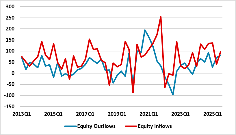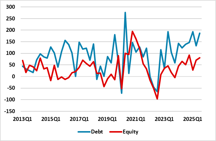 · Restricting holdings in U.S. assets. U.S. officials get jumpy about China selling its U.S. Treasury holdings or in previous decades Japanese investors repatriating from the U.S. However, a formal policy to restrict EZ or European holdings in the U.S. is highly unlikely, both due to the slow EU decision making and as EZ/European investing in the U.S. is from a huge range of investors that would oppose any moves to limit freedom of portfolio movements. However, could European investors be less inclined to invest in the U.S.? Our analysis of U.S. capital inflows suggests that global investors have not slowed equity/U.S. Treasury and corporate bond purchases (here) in 2025. Looking at ECB balance of payment data shows that global investor inflows into EZ equities are above the quarterly average since 2013, but EZ investors’ buying of global equities remain solid.