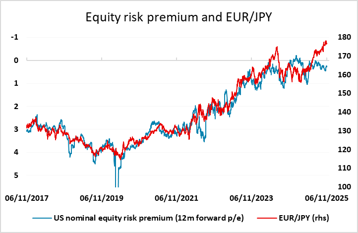 The USD has gained a little ground overnight against the safer havens, with the commodity currencies net little changed as equity indices bounced from initial losses. Equities are, however, still looking soft, with no real bounce from the decline seen on Thursday. We still see a case for the JPY to advance on the crosses, with EUR/JPY still broadly following equity prices, while the relationship with equity risk premia is still pointing lower. However, there may be some slightly further technical bounce after the losses of the last few days before we see another leg lower.