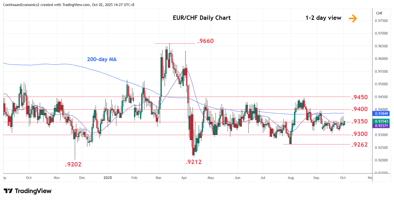 For today, it’s a quiet calendar due to the US government shutdown. The Swiss CPI data released this morning was in line with consensus on a m/m basis, but the y/y rate was a tad lower than expected, and this has helped EUR/CHF to move higher early in the session. We continue to see some upside risks for EUR/CHF, with 0.93 looking like a solid base. CHF valuation remains extremely high, and this should be challenged given very low yields and the likely negative economic impact of high US tariffs.