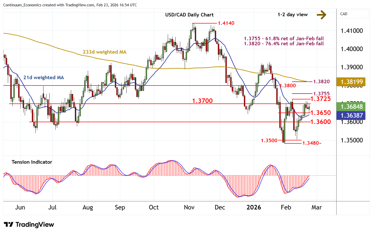 16:40 GMT - Still little change, as prices extend consolidation beneath resistance at congestion around 1.3700 and the 1.3725 weekly high of 6 February. The daily Tension Indicator continues to rise, highlighting potential for a retest of here. But a tick lower in overbought daily stochastics suggests any immediate tests could be limited in further consolidation, before improving weekly charts prompt further gains. Meanwhile, support remains at congestion around 1.3650. A break beneath here, if seen, should give way to consolidation above further congestion around 1.3600.