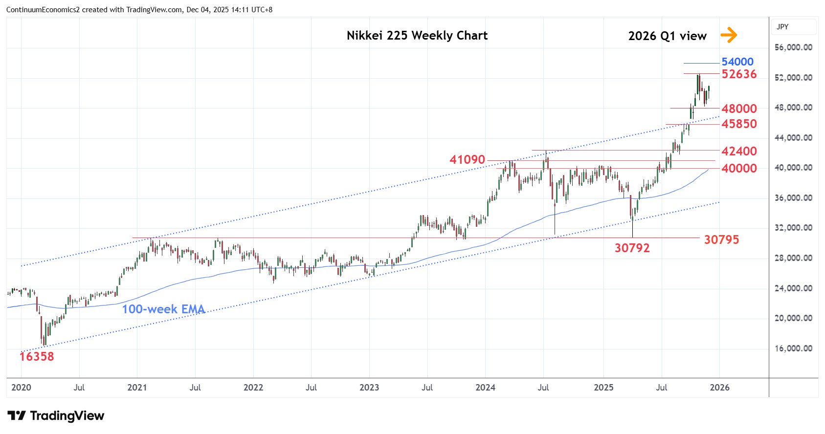 Corrective pullback is expected to give way to fresh gains later and break above the 52636 high will open up room for extension to the 54000. Gains beyond this, if seen, will see scope for extension to 56860, equality projection of the 2020/2024 rally from the 30792, April 2025 YTD low.