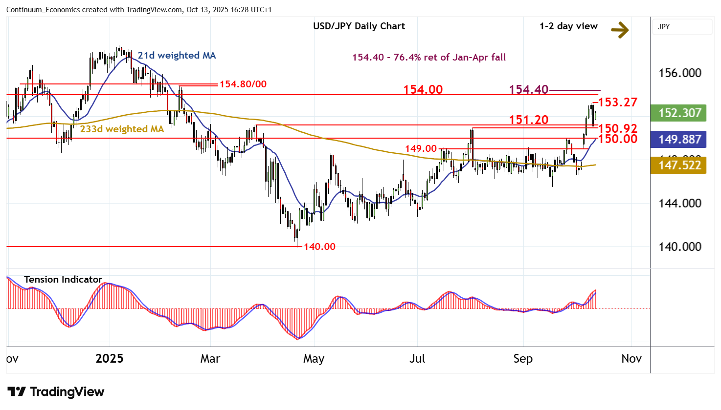 16:00 BST - The pullback into support at the 150.92 - 151.10 monthly highs from March-August has given way to a bounce, with prices currently trading around 152.30. Both daily and weekly charts are mixed, highlighting a cautious tone and potential for further consolidation into the coming sessions. However, longer-term readings are positive, pointing to potential for later gains. A close above the 153.25~ current year high of 10 October will turn sentiment positive and extend April gains towards critical resistance at congestion around 154.00 and the 154.40 Fibonacci retracement. Meanwhile, a close below 150.92/10, if seen, would turn sentiment neutral and prompt consolidation above congestion around 150.00.