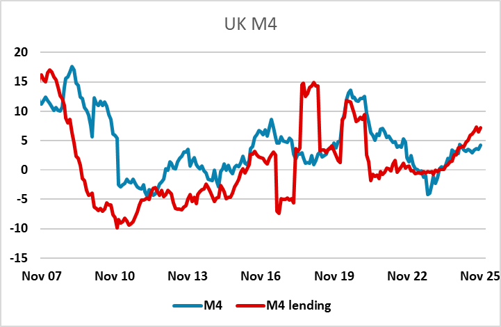 GBP has moved a little higher after the UK money data, which saw another strong gain in M4 and another above consensus rise in net lending to individuals. Much of this is in consumer credit rather than mortgage lending, and may reflect a need rather than a desire to borrow, so may not be an indication of strength. However, as long as money growth continues to accelerate, the market is likely to see it as a positive for GBP.
