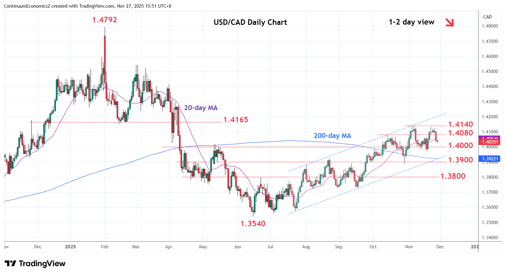 Consolidation at the 1.4100 level has given way to break of the 1.4080 support to open up room for deeper pullback