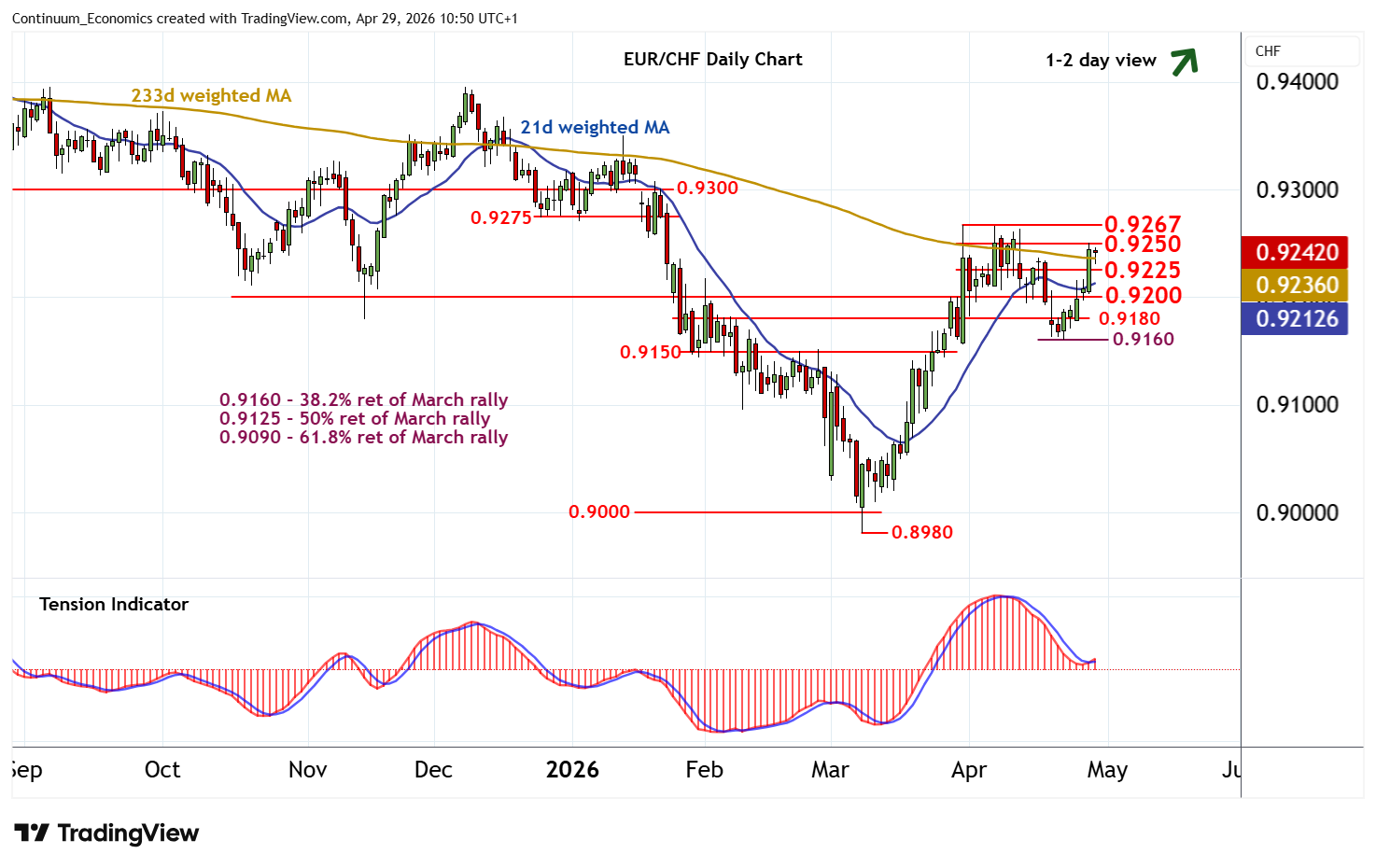 10:30 BST - Little change, as prices extend cautious/choppy trade beneath congestion resistance at 0.9250. Daily readings continue to rise, highlighting room for a test above here. But mixed weekly charts should limit initial scope in renewed consolidation beneath strong resistance at the 0.9267 monthly high of 31 March. A close above here, however, will turn sentiment positive and extend March gains into congestion within 0.9275 - 0.9300. Meanwhile, support remains at 0.9225 and extends to 0.9200. This range should underpin any immediate setbacks.
