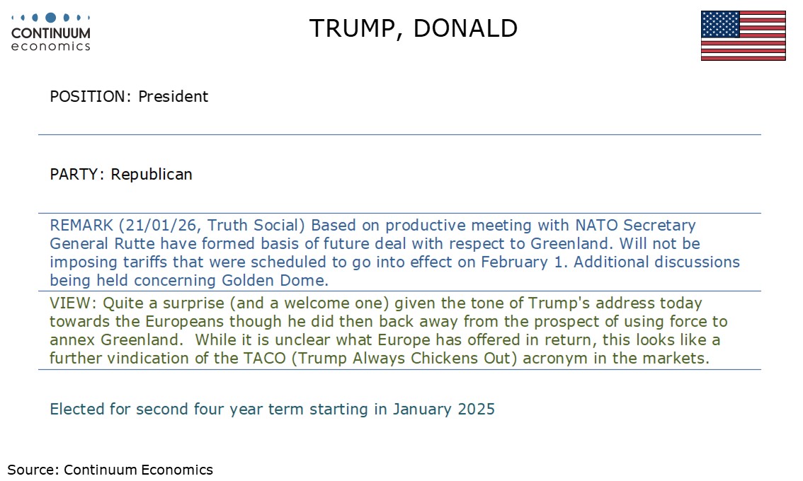 Trump, after backing away from using force, has now backed off the tariffs threatened on eight European nations over Greenland, lifting bonds and equities further..