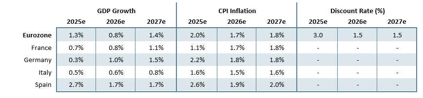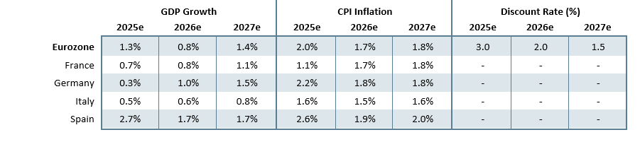 · This continues to reflect from late 2026 the competing forces of planned defense and infrastructure-induced fiscal expansion in the EU against the activity and a lingering tariff threat from the U.S. This contrast of near terms risks and medium-term hopes has persuaded the ECB to pause, if not end its easing, but we still forecast two more cuts in this cycle to a 1.5% ECB deposit rate, now more deferred than previously thought.