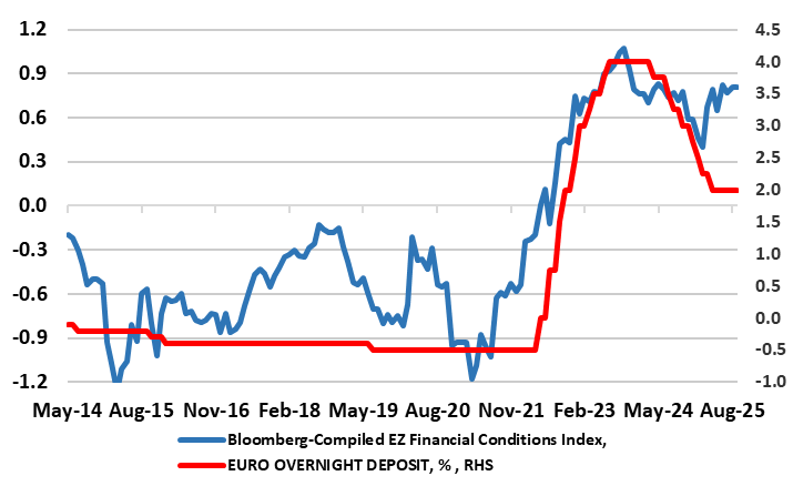 But the 2027 outlook is more encouraging as both the German fiscal stimulus and EU-wide defense build-ups take effect, this actually pointing to a gradual q/q pick-up in GDP through 2026. As for 2027 we have pencilled in a consensus-like 1.4% but still with downside risks on balance. This outlook reflects a host of uncertainties, some to do with the timing of likely fiscal and defense initiatives and some to do with to what degree they may boost EZ growth only modestly due to the likely large import content to begin with. Doubt also exists over the extent to which the economy may be tempered by what may be more sustained or protracted tightening in financial conditions (Figure 1) due to interest and exchange rates being higher than otherwise would be the case. Banks still show wariness about lending to firms, something that will add to restraint regarding capex over and beyond uncertainty. Indeed, there is also increased uncertainty emanating very much from political divides and policy paralysis in several countries (clearly France) and where, as suggested above, greater fiscal consolidation measures from several countries that will continue beyond next year. As for impact on the current account balance, the anticipated cyclical, and possibly structural, recovery in imports seen ahead, as well as what may be a weak global economy weighing on exports, will also mean that the improvement in the current account surplus last year (at around 2.6% of GDP) may reverse into 2026 and possibly even more so in 2027. This is also a headwind to GDP growth.