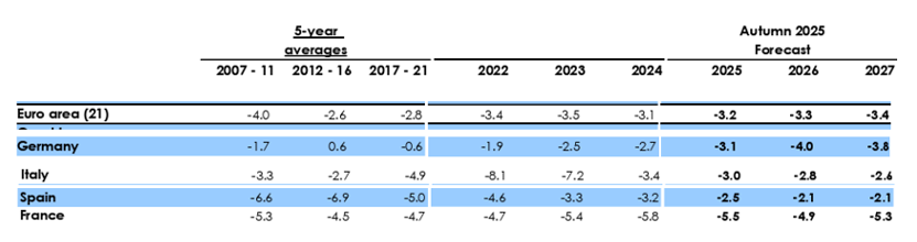 Fiscally, to suggest the backdrop and outlook is mixed would be an understatement. The overall EZ budget situation is likely to see small increases to above 3% of GDP into 2027, with the primary deficit largely stable at -1.2% and the structural gap similar to the headline numbers. But this masks marked differences among EZ members not least the Big 4 we assess in the Outlook (Figure 2). France is seeing policy paralysis; Italy running to keep fiscally still; Spain on an immigration induced-cyclical improvement and Germany a genuine fiscal swing and boost.