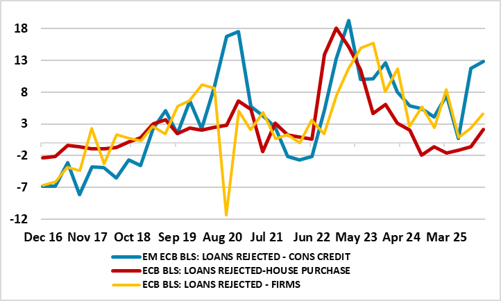 A fourth successive stable policy decision will be the almost inevitable outcome of this month’s ECB Council meeting resulting, with the discount rate left at 2.0%. The likely unanimous vote will mask splits about whether policy has troughed or not, this mainly a result of differences within the Council as to where inflation risks lie. But the ECB Council is likely to reassert that downside growth risks have dissipated somewhat, so that the current policy stance ‘in a good place’. Regardless, we think that the ECB may be overlooking a backdrop where the monetary transmission mechanism is not running as smoothly as it alleges. Indeed, even in nominal terms private sector credit growth has slowed. Moreover, we have highlighted several symptoms of a monetary policy transmission mechanism that, rather than functioning smoothly and effectively, is doing the very opposite and maybe increasingly so. These include survey evidence suggesting banks being increasingly willing to reject loan applications completely (Figure 3), something completely overlooked at the last ECB meeting!