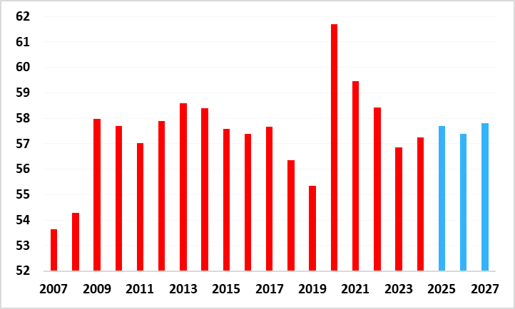 For a third successive Outlook, we see little rationale to alter our growth projections which are now consensus-like. GDP data of late have been moving sideways and even with a small positive increase projected in the final part of the year, GDP is forecast to grow by 0.5% in 2025. Private consumption is expected to continue expanding at a moderate pace, slightly exceeding that for GDP, this despite persistent uncertainty likely to see the savings rate stay above 12% of disposable income through the forecast horizon. Into 2026, fixed investment is set to accelerate, buoyed by EU RRF-backed non-residential construction projects, this offsetting a housing investment outlook still retreating, as the phasing out of tax credits is only partly offset by privately funded works. Investment, still propped up by the RRF, is set to continue growing, mainly thanks to construction activity. Net external trade is still forecast to weigh on GDP growth in 2025 and 2026, as exports recover less than imports (which are pulled by relatively strong domestic demand). But by 2027, household consumption, helped by a solid labor market (featuring record-high labor force participation) and actual real wage growth of 1%-plus, may be the main growth driver, as investment slows down following the end of the RRF. Based on an expected moderation in import growth, this points to GDP growth of 0.8% in 2027, 0.2 ppt above our unrevised 2026 forecasts. As a result, we see the current account surplus staying just over 1% of GDP to 2027 but with upside risks at time goes by as Italy’s large arms exports (5% of the global market) benefits from rising EU defense spending and where import prices may continue to drop.