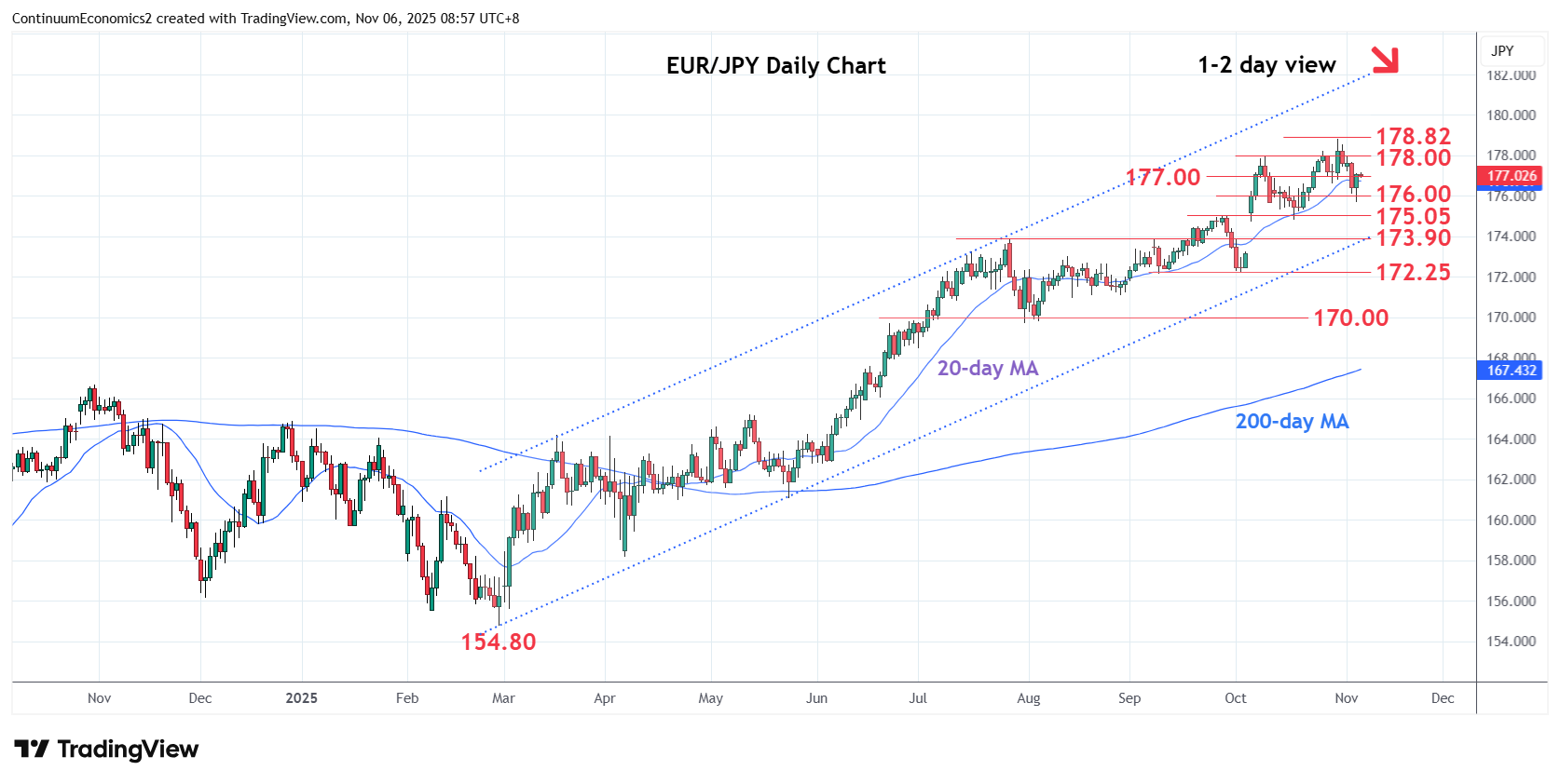01:10 GMT - Limited on break of the 176.00 level with bounce from the 175.70 low unwinding oversold intraday studies and returning to consolidate at the 177.00 level. Higher will see room to the 178.00 congestion which is expected to cap. Negative daily studies suggest this giving way to renewed selling pressure later to retest the 175.70 low. Break here will turn focus to strong support at 175.05/173.90, September and July highs. Below this will open up room for deeper pullback to retrace the February/October rally.