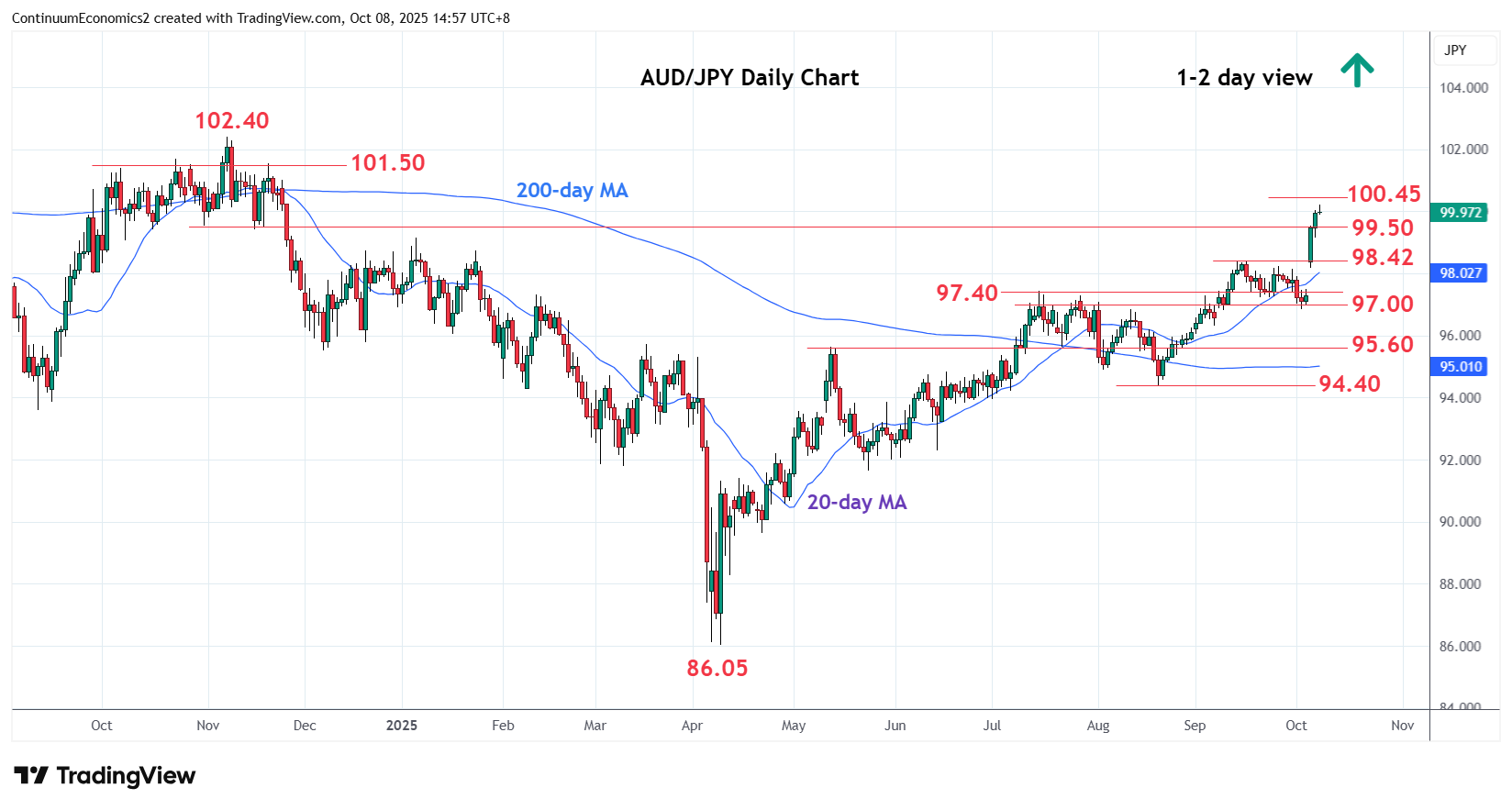 Chart AUD/JPY Update: Consolidating test of 100.00, room for higher