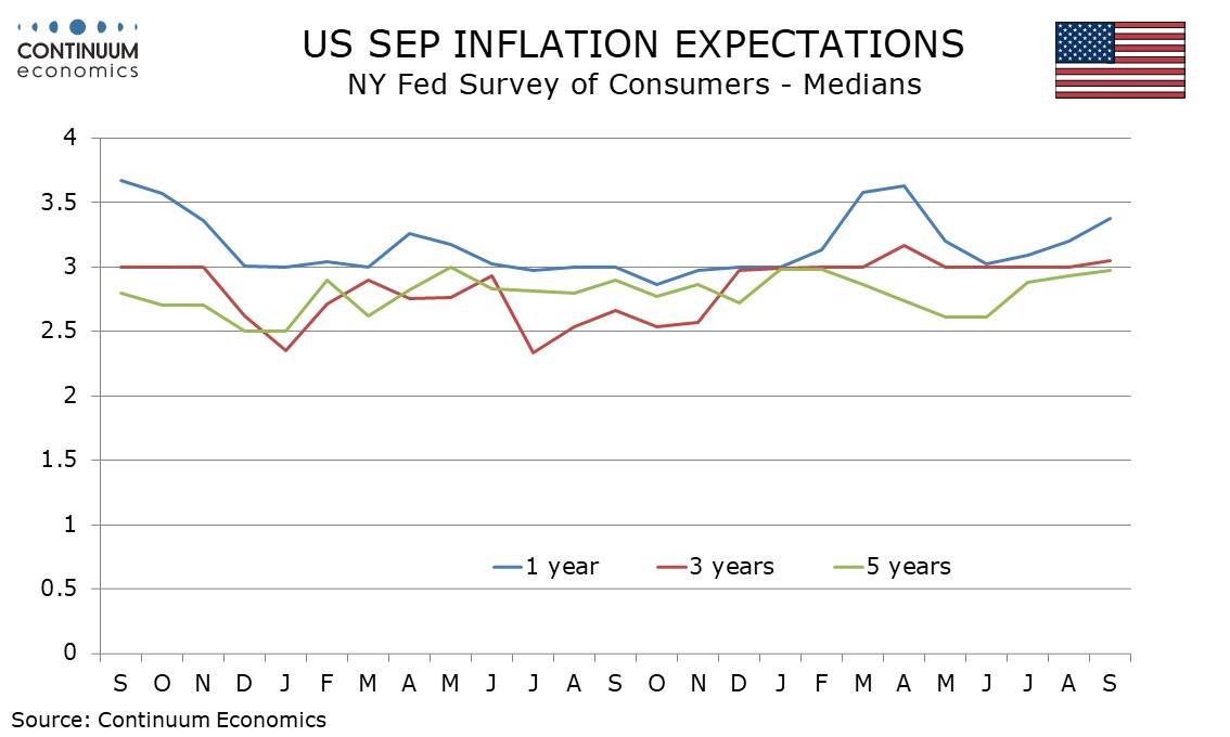 The New York Fed’s September Survey of Consumer Expectations shows modest rises in inflation expectations on a 1, 3 and 5-year basis.