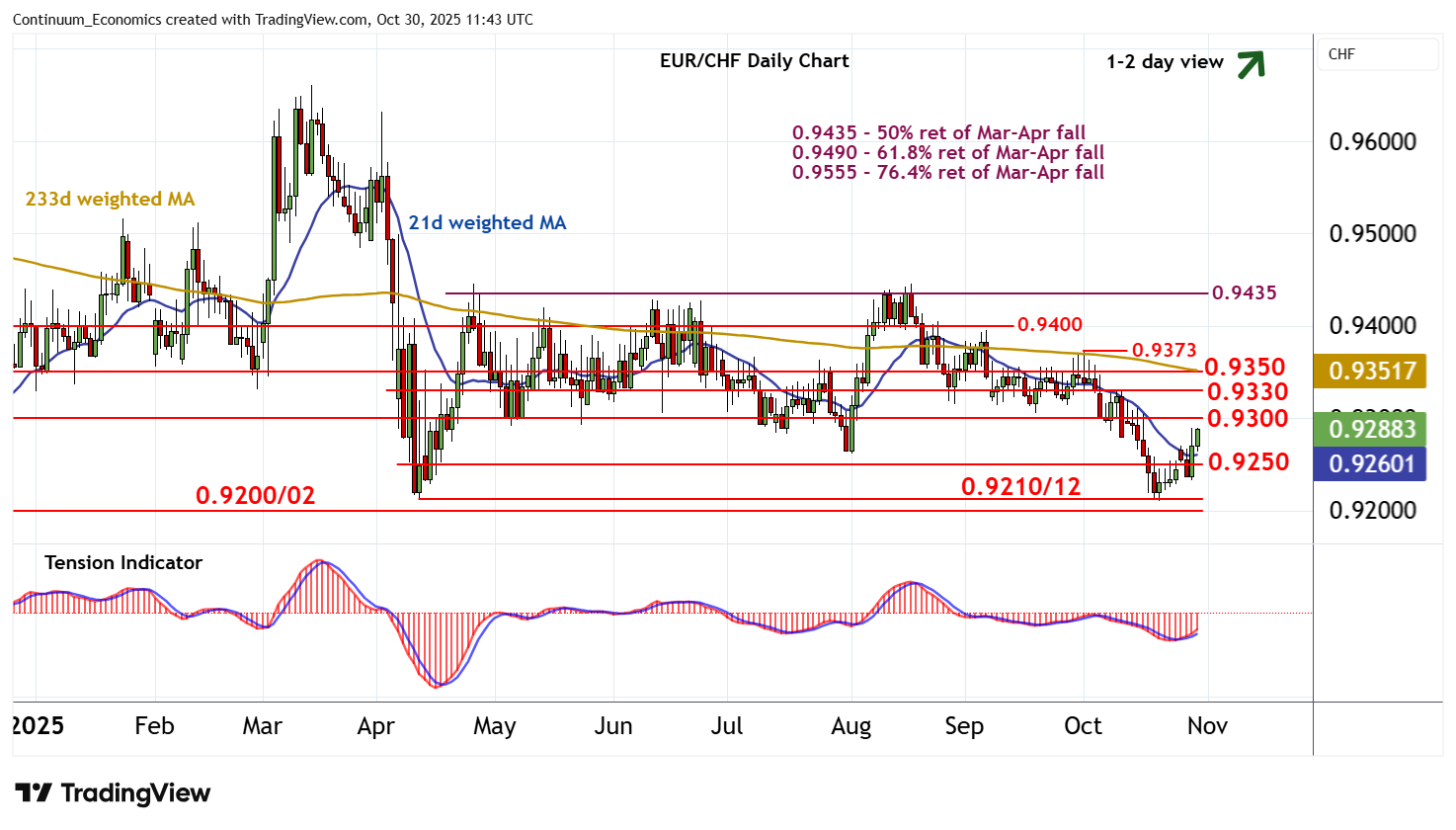 10:55 GMT - Little change, as prices extend cautious trade just beneath congestion resistance at 0.9300. Rising daily readings highlight room for a test of here. But mixed/negative weekly charts are expected to limit any break in renewed selling interest/consolidation towards congestion within 0.9330/50. Meanwhile, any immediate tests below support at 0.9250 should give way to consolidation above critical support within the 0.9200 - 0.9212 range.