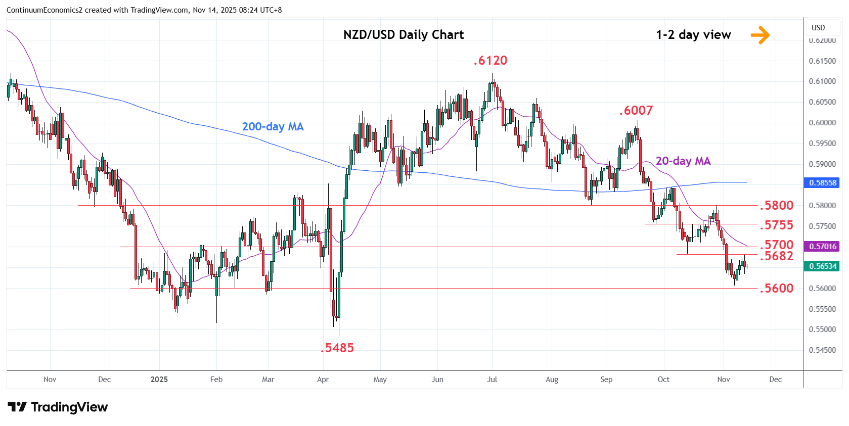00:25 GMT - Bounce attempt has seen gains checked at the .5682 resistance and see prices settling back to consolidate around .5650. Consolidation is expected to give way to renewed buying interest later and break above resistance at the .5682/.5700 area will see room to extend gains from the .5606 low. Higher will see stronger gains to retrace losses from the .6007 September high to resistance at .5755/.5800, September and August lows. Meanwhile, support at .5606/00 area should underpin. Only below here will further extend the July losses and see potential for retest of the .5485, April current year low.