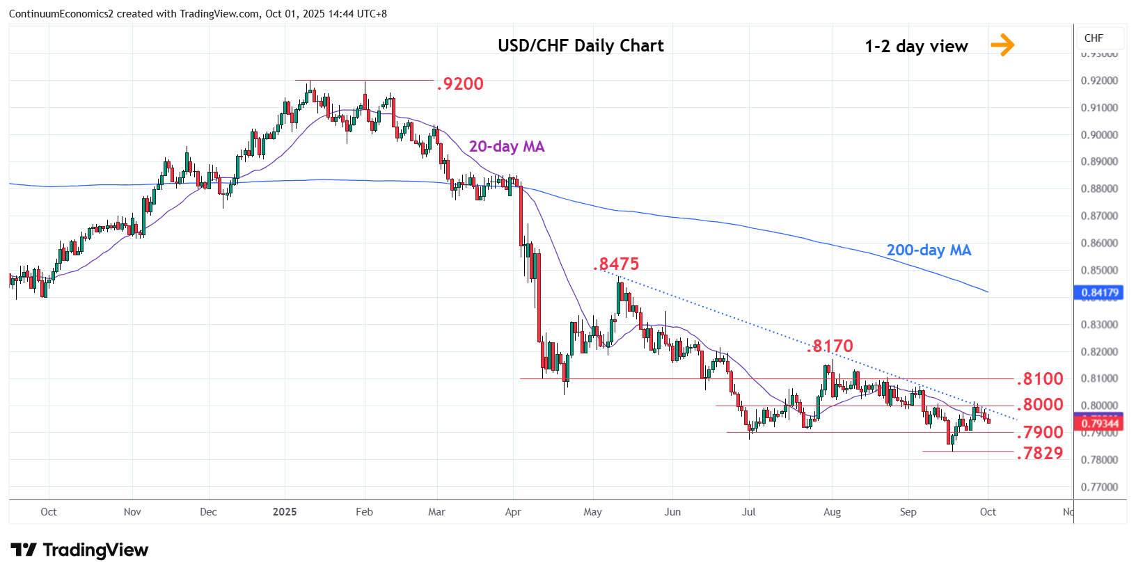 Chart USD/CHF Update: Leaning lower in consolidation from the .8000 level