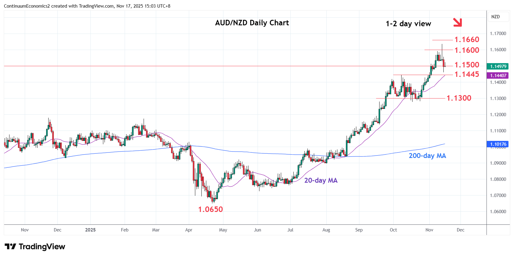 07:30 GMT - Settled into consolidation at the 1.1500 level following rejection from the 1.1636 current year high. Daily and weekly studies are unwinding overbought readings and suggest room for deeper pullback to retrace the April/October rally. Below the 1.1500/1.1445 congestion and October high will see room to the 1.1400 congestion. Lower still, will see room to 1.1350/1.1300 area. Meanwhile, resistance is lowered to 1.1550 congestion which is expected to cap and sustain pullback from the 1.1636 high.