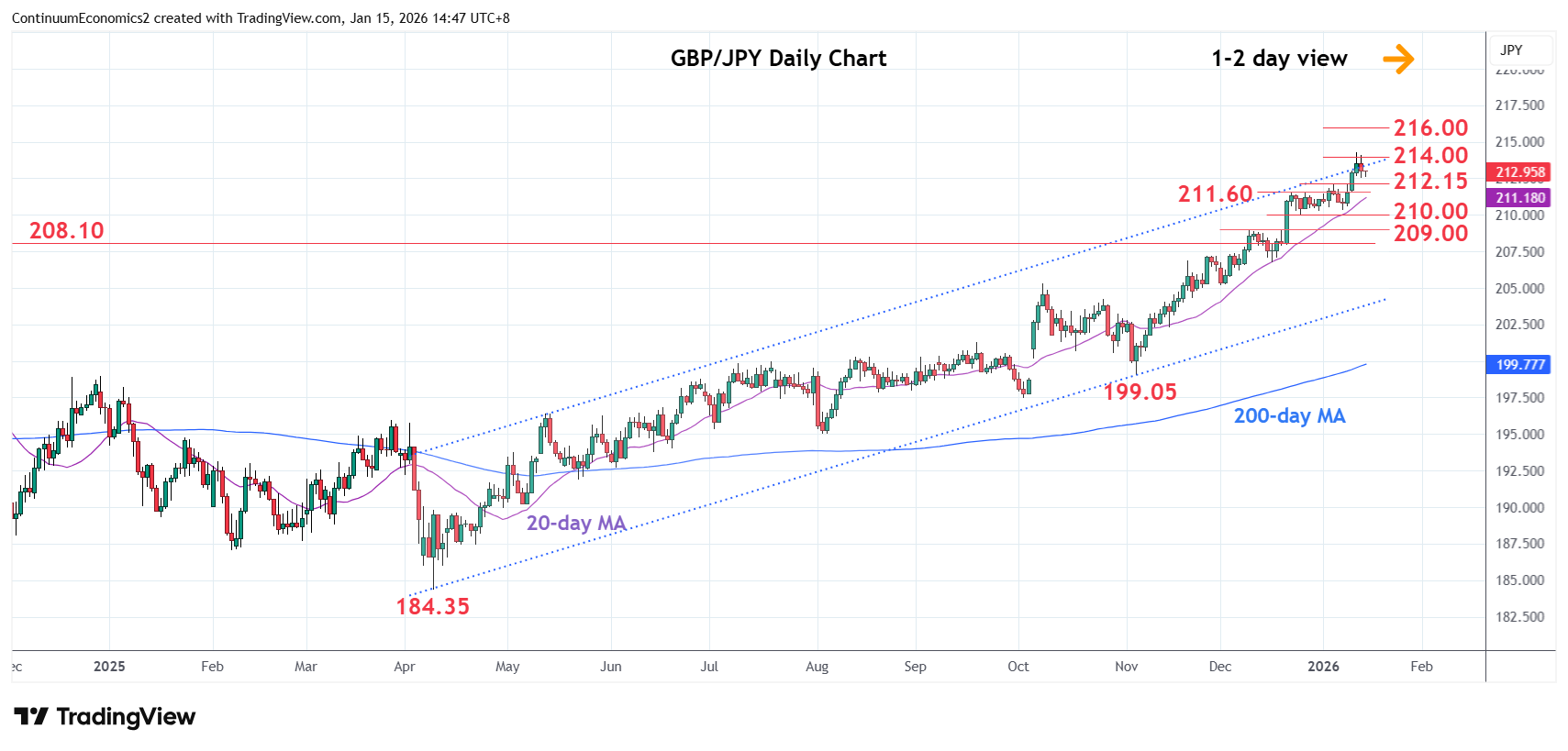 07:50 GMT - Limited on break of the 214.00 level as prices gave way to selling pressure at the 214.30 high to unwind overbought intraday studies. Daily and weekly studies are stretched as well and caution deeper pullback to retrace strong gains from the 199.00 low of November. Meanwhile, support is raised to the 212.00/211.60 congestion area and late-December high. Break here will open up room for deeper correction to support at 210.00 and the 209.00/208.10, 9 December high and 2024 year high.