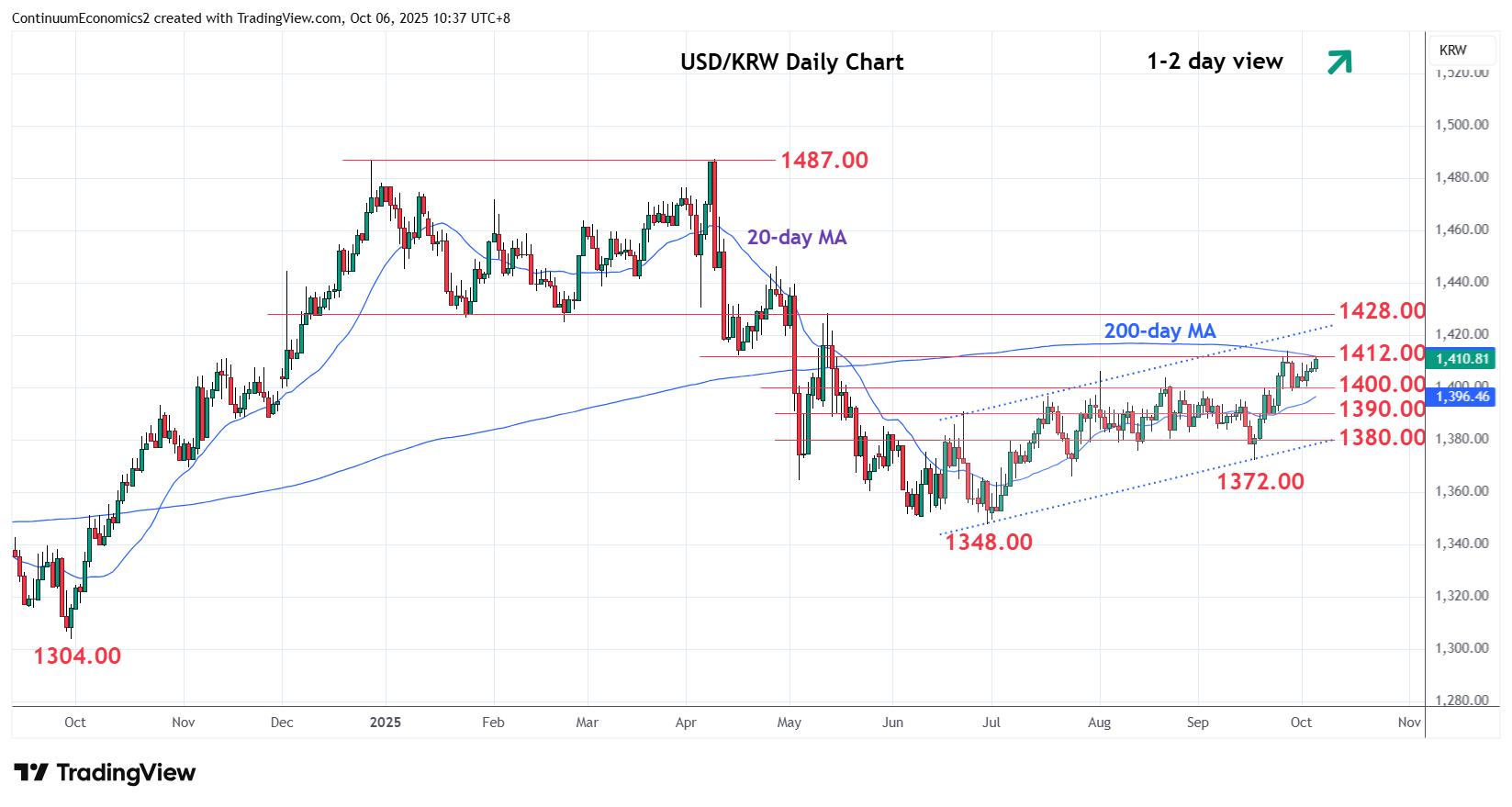 Chart USD/KRW Update: Back to retest 1412.00/1414.00 resistance