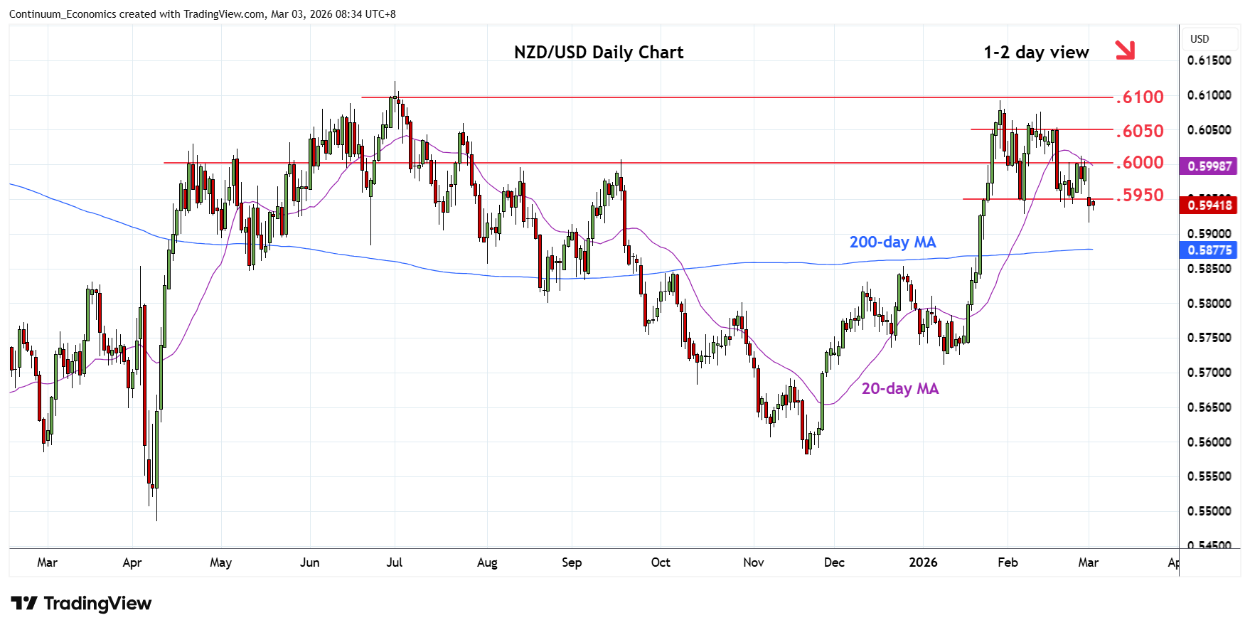 00:40 GMT - Saw break of support at the .5950 congestion as prices extend losses from the January high to reach .5916 low. Consolidation here see prices unwinding oversold intraday studies but the negative daily and weekly studies keep pressure on the downside and see room for extension to the .5900, 50% Fibonacci level. Lower still, will open up room to the strong support at the .5850 congestion and 76.4% Fibonacci level. Meanwhile, resistance at the .5950/.6000 congestion is expected to cap. Regaining this needed to fade the downside pressure and revive the upside focus.