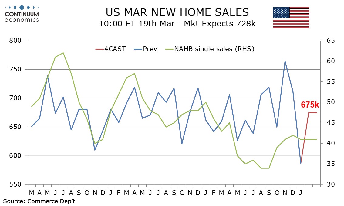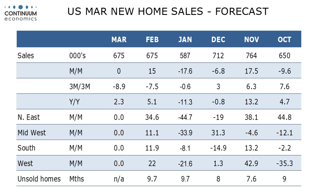 New home sales for both February and March will be released on May 5. We expect a level of 675k in each month, which would be up by 15.0% from January’s 587k, which was the lowest level since October 2022. January’s data was well below recent trend and may have been weather-impacted. We would not be surprised to see January revised higher.