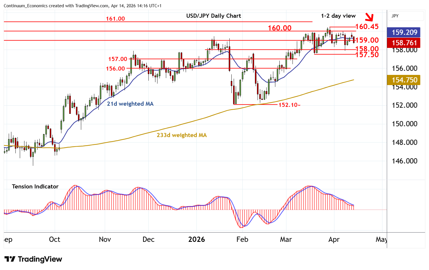 14:05 BST - Consolidation is giving way to a pullback, with the break below 159.00 currently trading around 158.70. Daily readings are coming under pressure and broader weekly charts are mixed/negative, highlighting room for continuation down to support at the 158.00 break level. However, a close below the 157.50 weekly low of 19 March would turn sentiment negative and extend late-March losses below the 157.35 Fibonacci retracement towards congestion around 157.00. Meanwhile, a close back above congestion resistance at 159.00 would stabilise price action and prompt consolidation beneath 160.00.