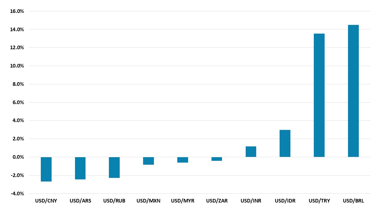 · On a total return basis over the next 12 months, BRL stands out due to the prospect of still very wide interest rate differentials. The TRL will attract carry trades also, but will likely be more volatile. The CNY will likely still see negative total returns versus the USD (Figure 1), as interest rate differentials will remain adverse.