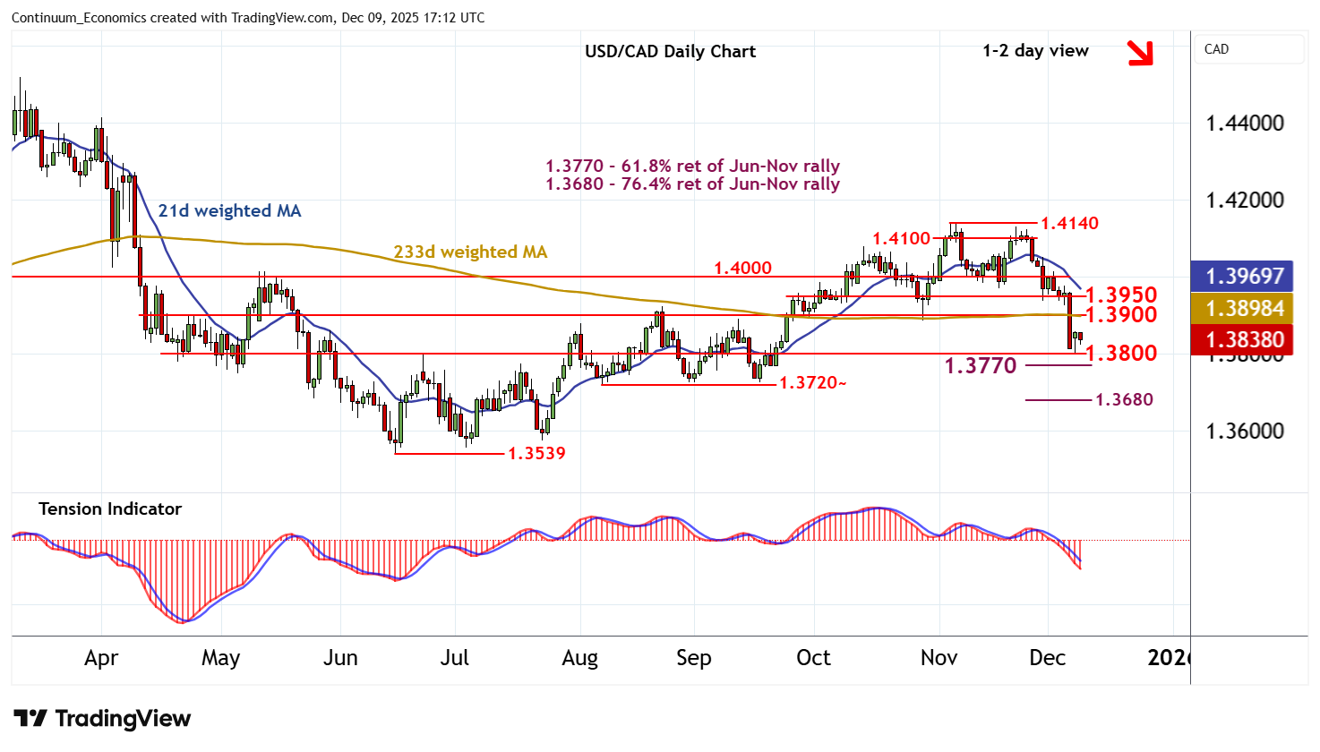 16:45 GMT - The test of congestion support at 1.3800 is giving way to consolidation, as intraday studies turn mixed and oversold daily stochastics flatten, with prices currently trading around 1.3835. The daily Tension Indicator continues to track lower and broader weekly charts are bearish, highlighting room for further losses in the coming sessions. A break below 1.3800 will open up the 1.3770 Fibonacci retracement, where fresh consolidation could develop, before November losses extend still further. Meanwhile, a close above resistance at the 1.3900 break level will help to stabilise price action and prompt consolidation beneath 1.3950.