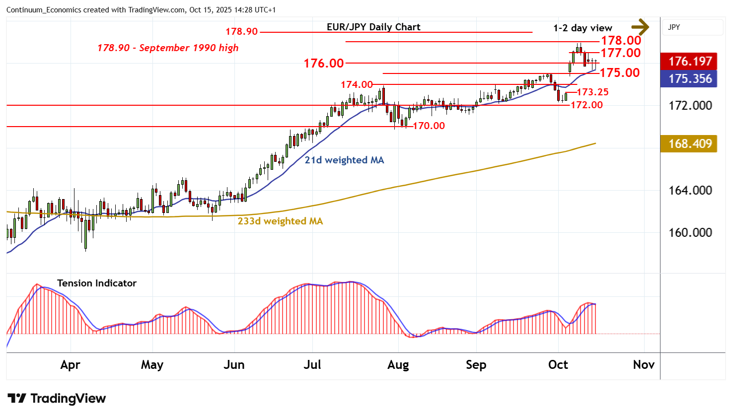 14:15ST - The test back below 176.00 has bounced from 175.45, as intraday studies turn higher, with prices once again trading above 176.00. Daily readings are mixed/negative and broader weekly charts coming under pressure, highlighting difficulty sustaining further gains. Resistance at 177.00 should remain intact into any further gains. In the coming sessions, cautious trade is expected to give way to fresh losses. A break back below 176.00 will open up congestion support at 175.00, with potential for continuation down to 174.00.