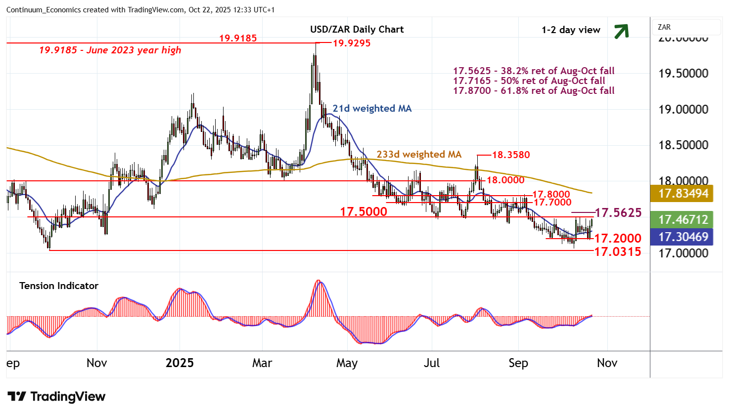 12:20 BST - The bounce following the test of congestion support at 17.2000 is extending, with prices currently balanced just below congestion resistance at 17.5000. Daily stochastics and the daily Tension Indicator have turned higher, highlighting room for further strength in the coming sessions. A break above here will improve sentiment and extend October gains towards the 17.5625 Fibonacci retracement. Rising weekly charts point to room for continuation towards congestion around 17.7000. Meanwhile, support remains at congestion around 17.2000, and should underpin any immediate setbacks.