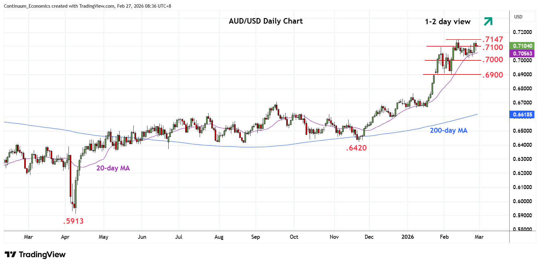 00:40 GMT - Break above the .7100 level has seen gains stalling ahead of the .7147 current year high. Mixed daily studies suggest consolidation likely to extend beneath here but a later break cannot be ruled out. Clearance will see room to extend the underlying bull trend and see scope for extension to target .7205, 61.8% Fibonacci retracement. Higher still, will open up room to .7280, June 2022 high. Meanwhile, support is at the .7100/.7050 congestion area which should underpin. Would take break of these and the .7015 low to fade the upside pressure and open up room for deeper pullback.