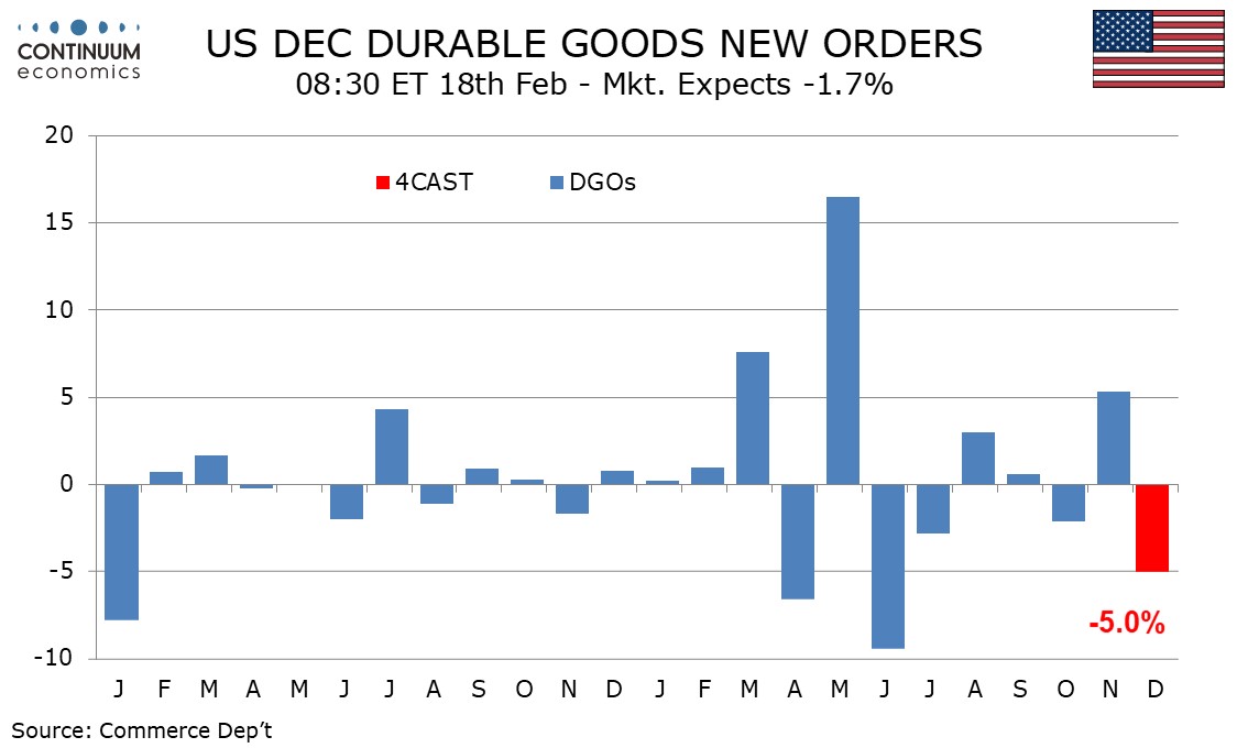 We expect December durable goods orders to fall by 5.0% after a 5.3% increase in November, the reversal led by aircraft after a strong November increase. Ex transport we expect a 0.4% increase, matching the gain in November. Boeing orders were only slightly lower in November after a sharp rise in November but seasonally adjusted a full reversal of November’s aircraft increase in the durable goods orders data should be seen. Autos are likely to see little change but we expect a bounce in defense, which has a large overlap with transport, after two straight declines. Ex defense expect a fall of 5.7% after a 6.3% increase in November.