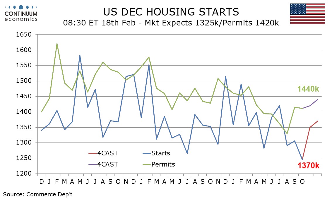 Housing starts and permits data for both November and December are due on February 18. For starts we expect a rise of 8.3% in November to 1350k to follow a decline of 4.6% in October, with a more moderate 1.5% increase to 1370k in December. For permits we expect moderate gains of 0.6% in November, to 1420k, and 1.4% in December, to 1440k. The housing sector picture generally picked up moderately in Q4, assisted by Fed easing, though non-farm payroll details were more constructive for construction in November than December. New home sales data is available only through October, with November and December data due on February 20.