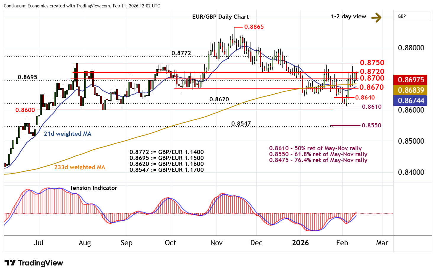 11:50 GMT - Still little change, as prices extend cautious/choppy trade within resistance at 0.8695/00 - 0.8720. Intraday studies are leaning lower and overbought daily stochastics are flattening, suggesting room for a test lower in the coming sessions. A break below 0.8695/00 will open up congestion around 0.8670. But the positive daily Tension Indicator and improving weekly charts should limit any initial tests in renewed buying interest/consolidation. Meanwhile, resistance remains at congestion around 0.8720. But a close above further congestion around 0.8750 is needed to improve sentiment and extend February gains initially to 0.8772, (GBP/EUR 1.1500).