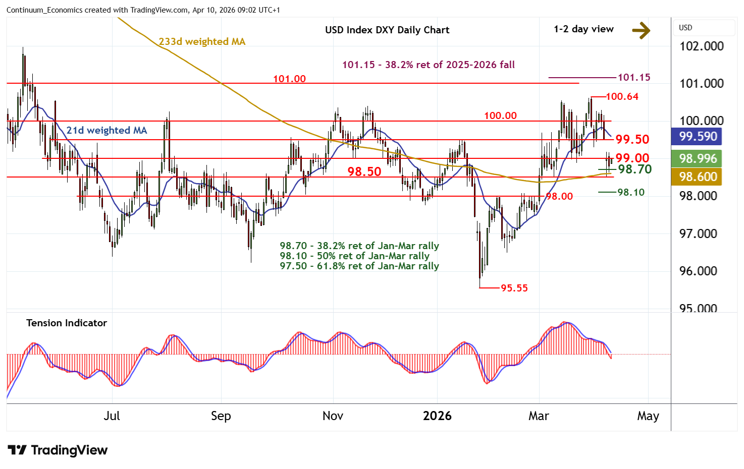 Little change, as prices extend cautious trade beneath resistance at congestion around 99.00 and the 99.18 high of 8 April