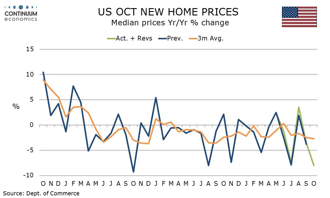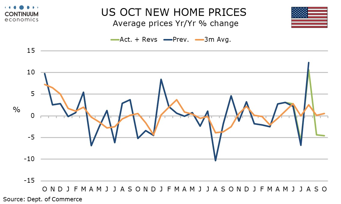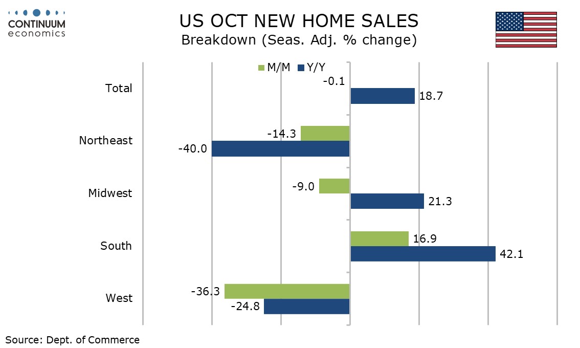 October new home sales at 737k are slightly above consensus and almost unchanged from September’s 738k, which was released for the first time with this October report. August however was revised down quite sharply from a surprisingly strong 800k to 711k, while June and July were also revised lower.