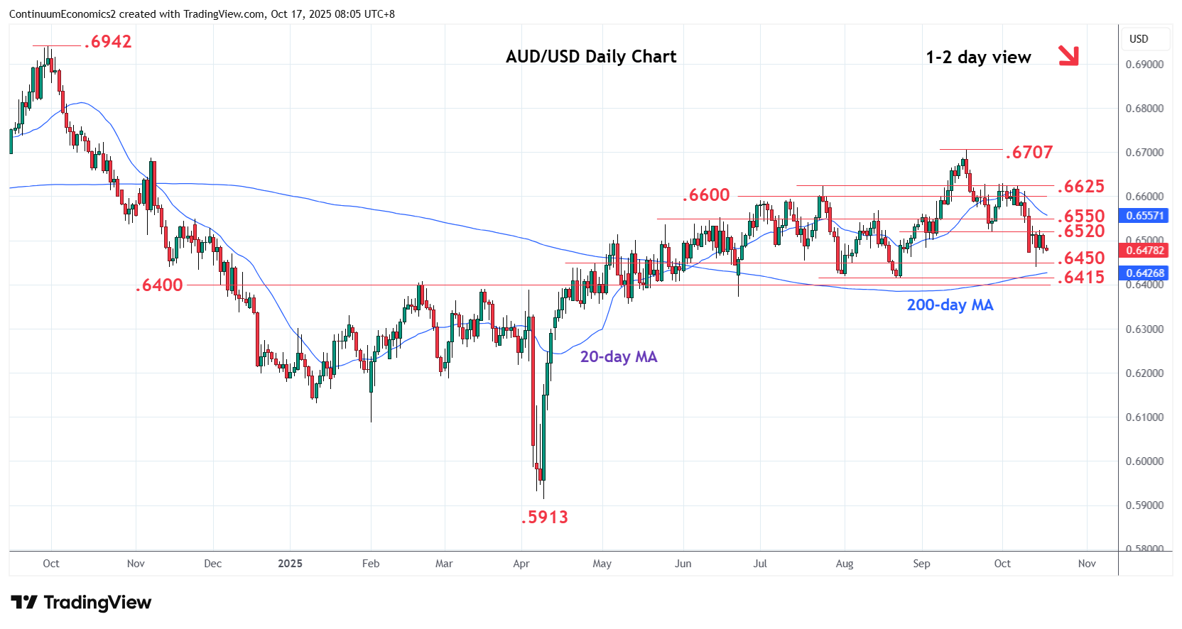 00:10 GMT - Leaning lower in consolidation below the .6520 resistance to weigh on the .6470 support. Would take break here to to open up room for retest of the .6440 low and see room for deeper pullback to retrace the April/September rally. Lower will see extension to retest strong support at .6415/00, the August low and 38.2% Fibonacci level. Meanwhile, resistance is at .6520 and this extend to the .6550 congestion which is expected to cap and sustain losses from the .6600/25 resistance.